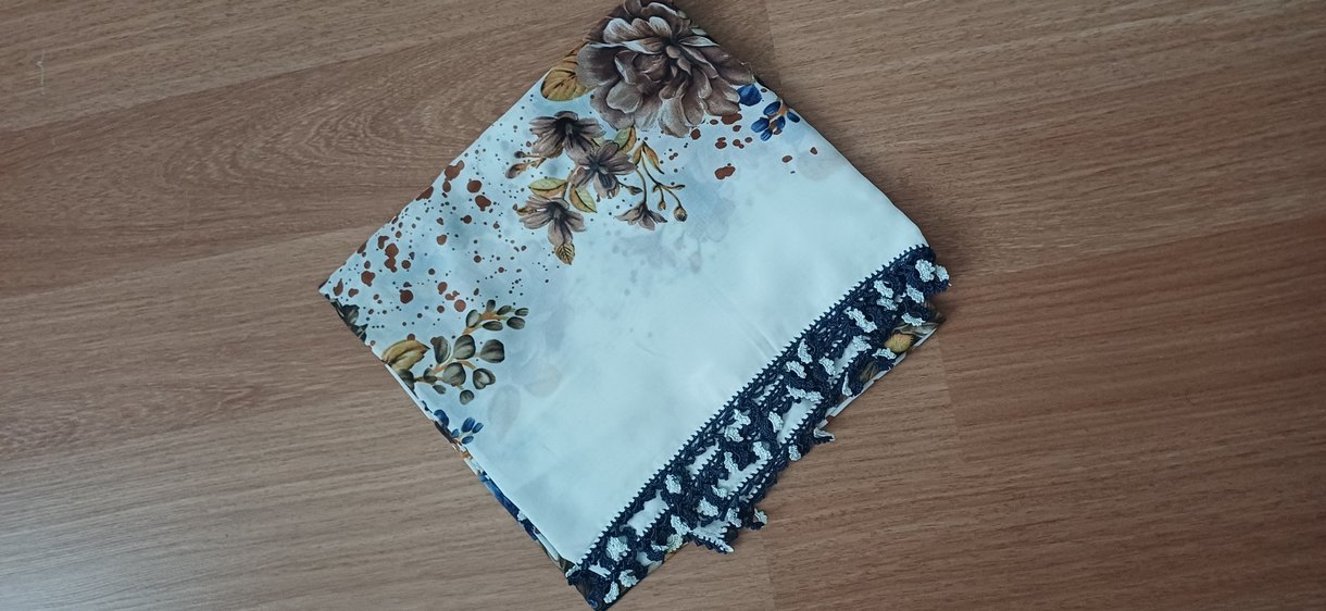 Kadın fuları, mavi ve gri çiçek desenli, dantel detaylıdır. Yumuşak sentetik kumaştan yapılmış bohem tarzdadır.