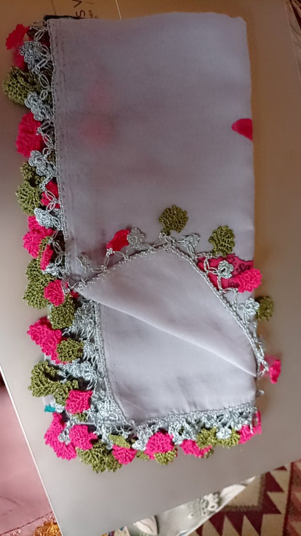 Yumuşak gri dokuma üzerine canlı pembe ve zeytin yeşili tığ işi dantel detaylı, bohem tarzda kadın fular.