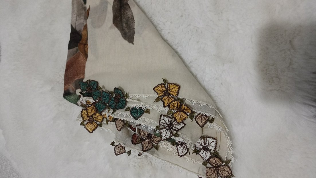 Dantel kenarları ve renkli işleme yapraklarıyla bohem tarz kadın fular. Beyaz ve gri tonlarda yumuşak tekstil kumaştan yapılmıştır.
