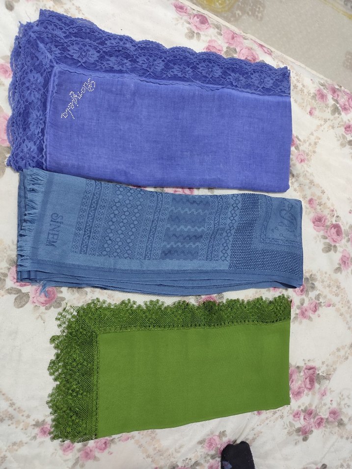 Dantel detaylı, koyu renklerde mavi, yeşil ve teal tonlarında bohem tarzda kadın şal seti.