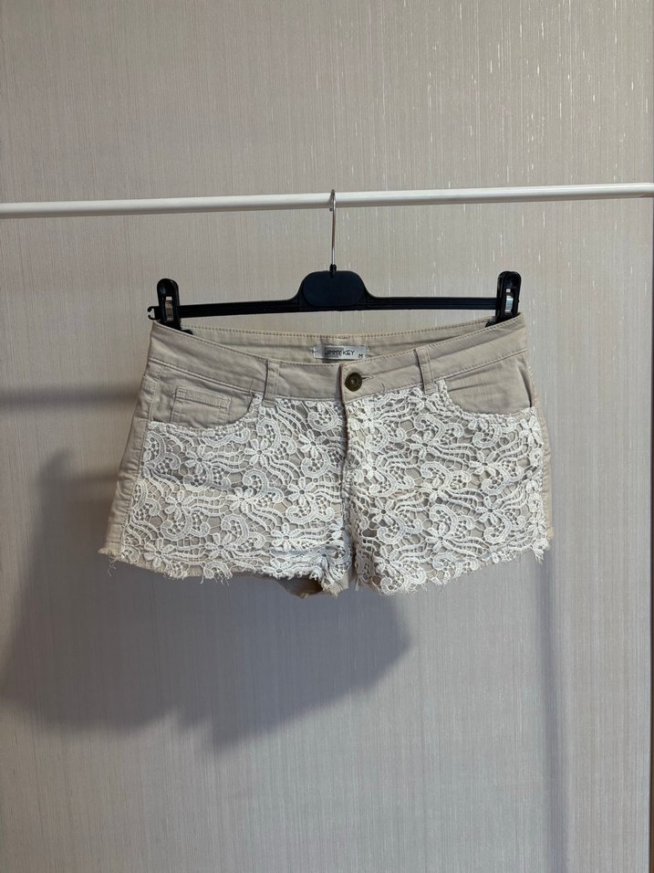 Bej renkli, bol kesim kot şort, beyaz dantel işlemeleriyle bohem tarzını yansıtıyor, dış mekan kullanımı için uygun.