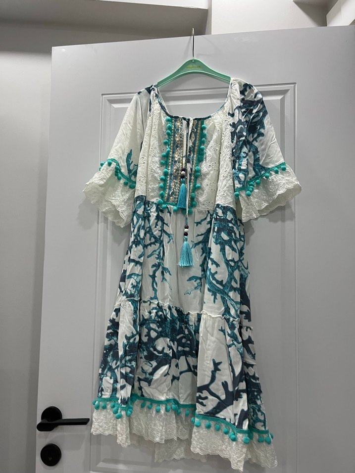 Bohem tarzda, turkuaz ve gri tonlarda batik desenli, dantel kısa kollu, straplez yakalı, püskül ve ponpon detaylı bol kesim mini elbise.