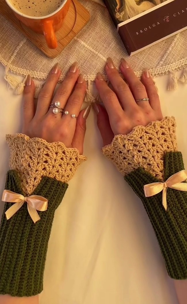 Pastel haki renkli, dantel detaylı ve kurdeleli bohem tarzda örgü kadın eldiven. Sıcak ve retro bir hava katıyor.