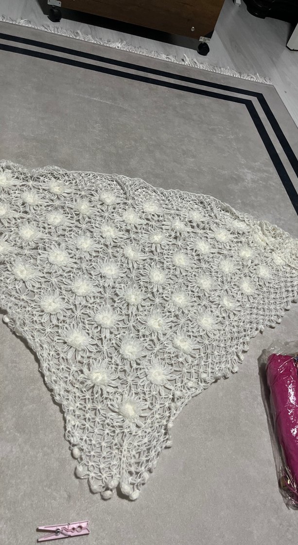 Bu kadın şalı, beyaz renkte dantel detaylı örgü kumaştan yapılmıştır. Bohem ve retro tarzıyla rahat bir görünüm sunar.