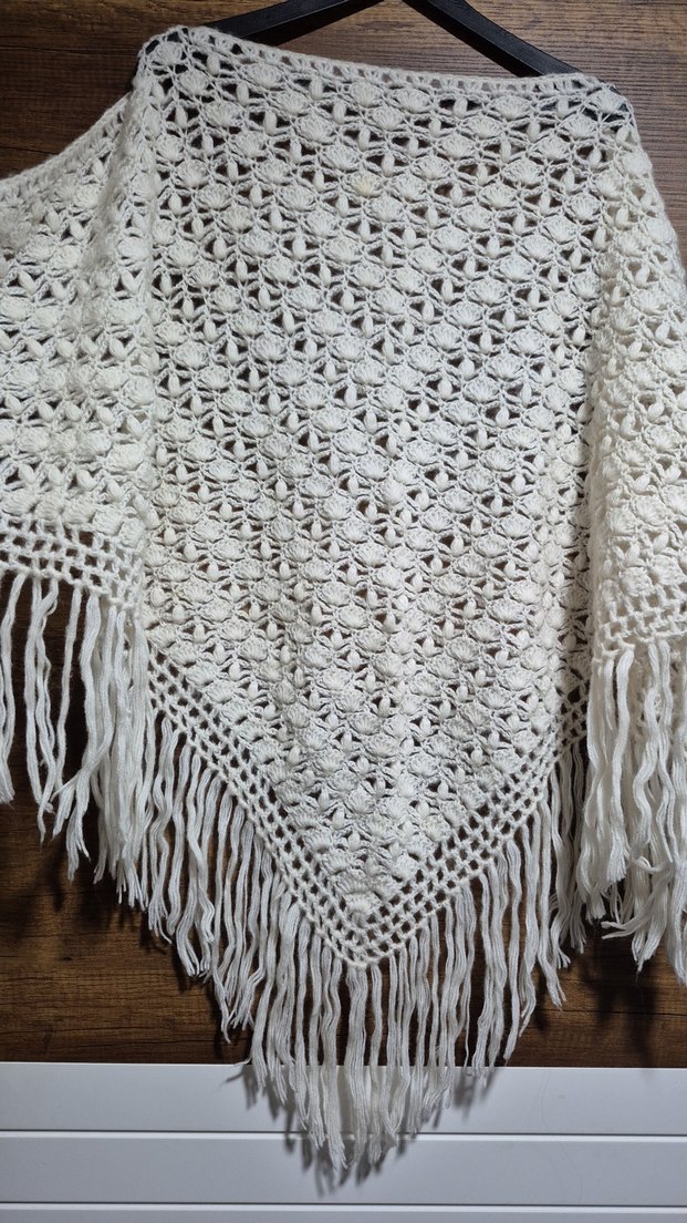 Dantel detaylı, püsküllü bohem tarzda kadın örtüsü. Yumuşak örme kumaştan, beyaz-gri tonlarında, retro ve hippie havası verir. Sandık ürünüdür