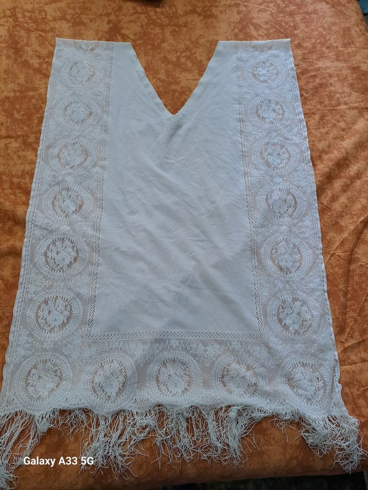 Dantel detaylı, püsküllü beyaz tekstil şal. Bohem tarzda, yumuşak ve hafif kumaştan yapılmıştır.