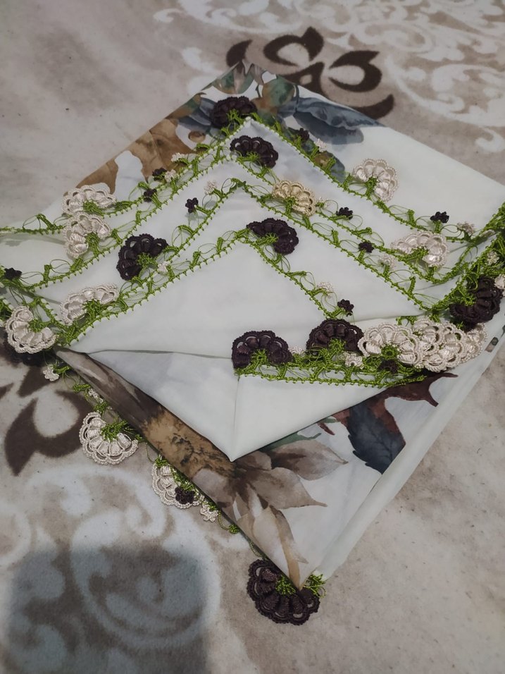 Yeşil ve mor çiçek işlemeli dantel kenarlarıyla beyaz tekstil kadın şalı, bohem tarzını yansıtıyor.