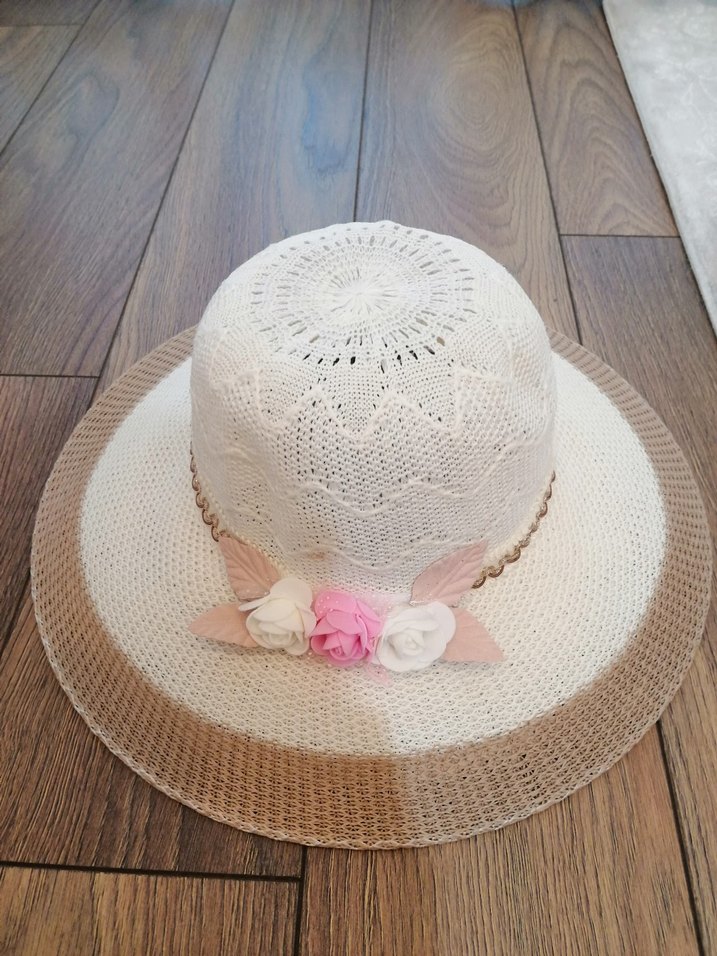 Dantel detaylı, örme kumaştan yapılmış, pastel renkli çiçek süslemeli beyaz-bej bohem kadın şapka. Hiç bir