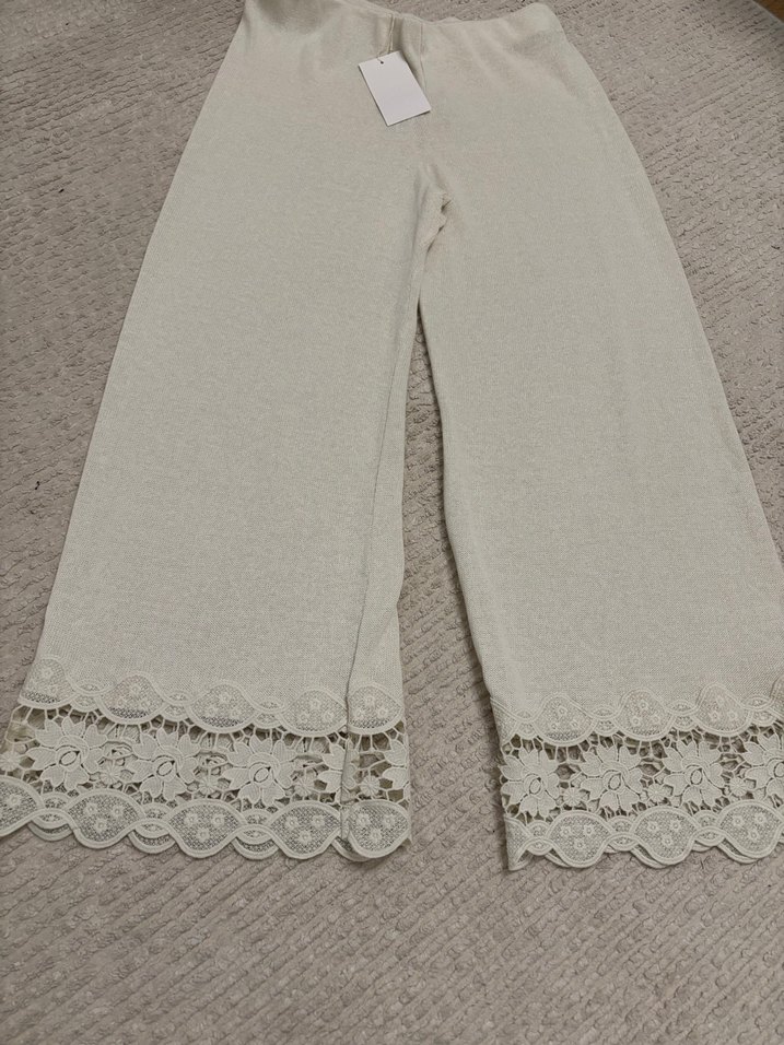 Bej renkli triko pantolon, bol kesim ve uzun boy. Etek ucu işlemeli dantel detaylarıyla bohem ve rahat bir tarz sunar.