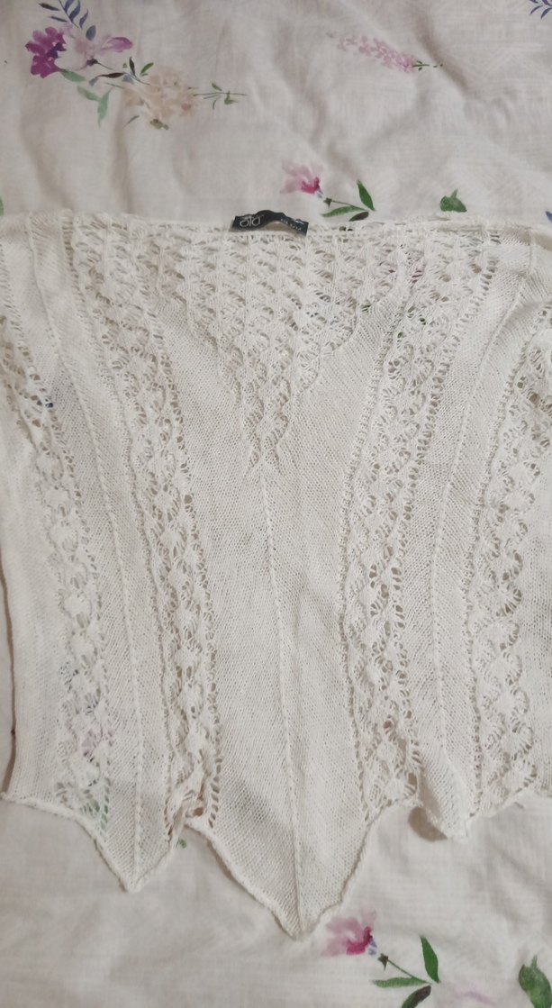Dantel detaylı beyaz triko şal, bohem ve retro tarzda, yumuşak ve nefes alabilen dokusuyla hippie görünüm sağlar.