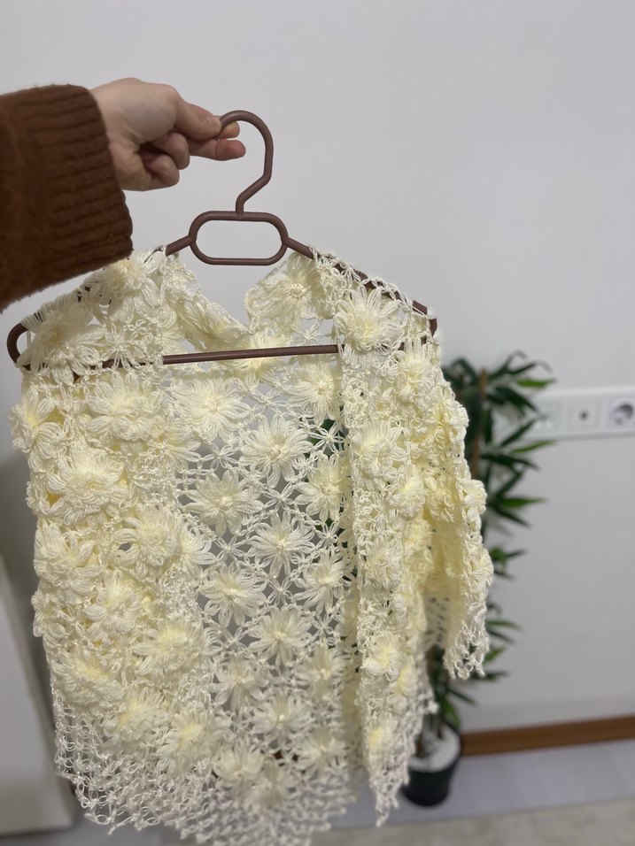 İnce dantel detaylı, beyaz triko kadın şal. Bohem ve rahat tarzda, retro ve hippie görünüme uygun.