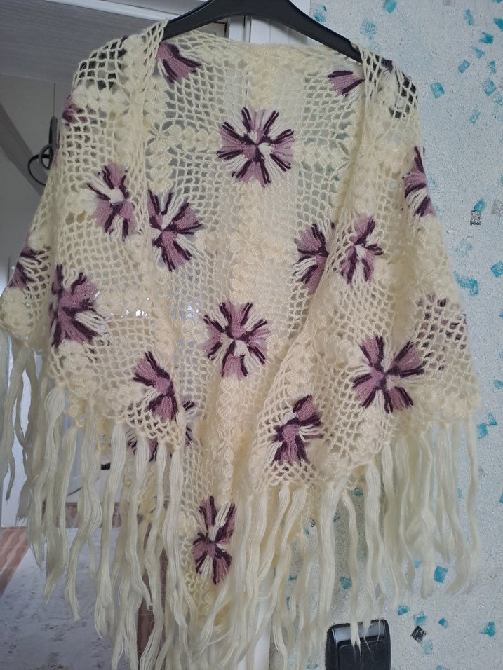 Kadın triko şal, pastel çiçek desenleri, dantel detaylar ve püsküllü kenarlarla bohem tarzını yansıtıyor.