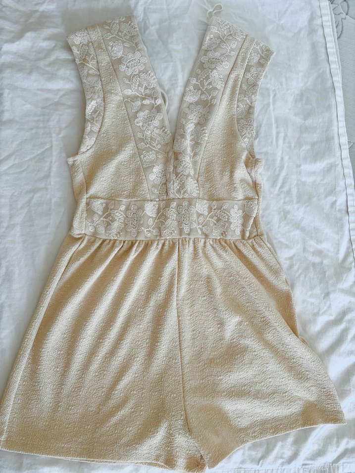 Keten kumaştan, dantel detaylı ve v yaka kesime sahip bej renk mini tulum. Bohem ve vintage tarzıyla düğünler için uygun, vücuda oturan kesim.