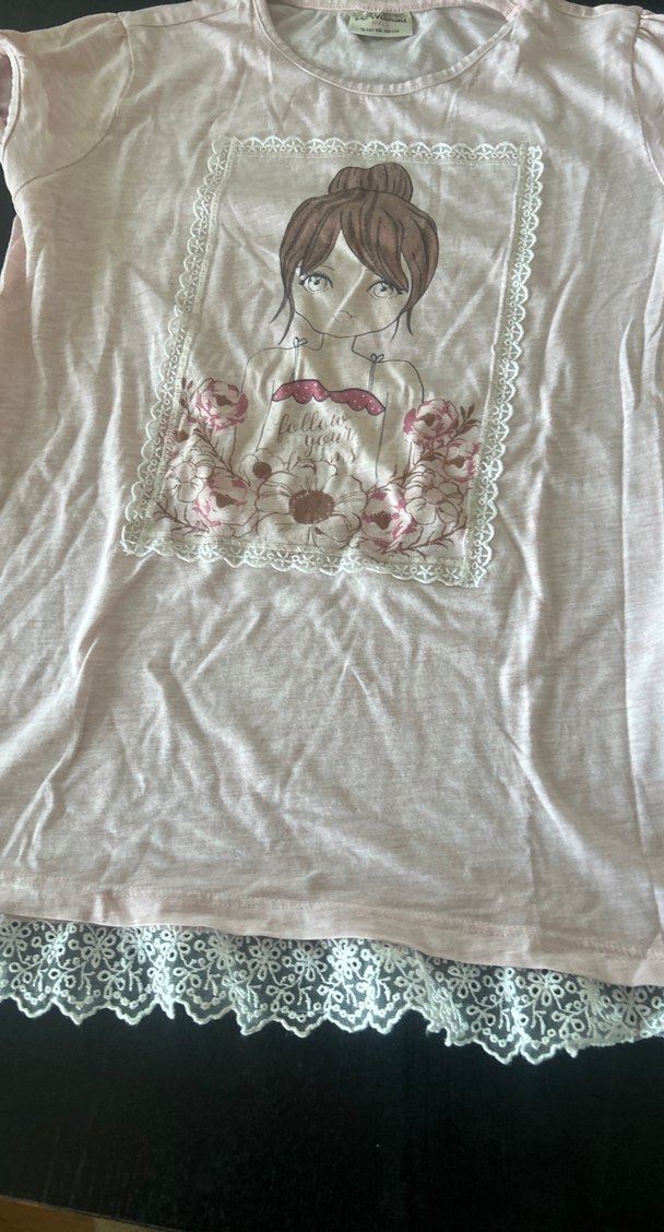 Pamuklu, bol kesim, kısa kollu, yuvarlak yaka kız tişörtü. Ön ve etek kısmında dantel detaylı, baskılı bohem desenlere sahip, pastel pembe renkte.