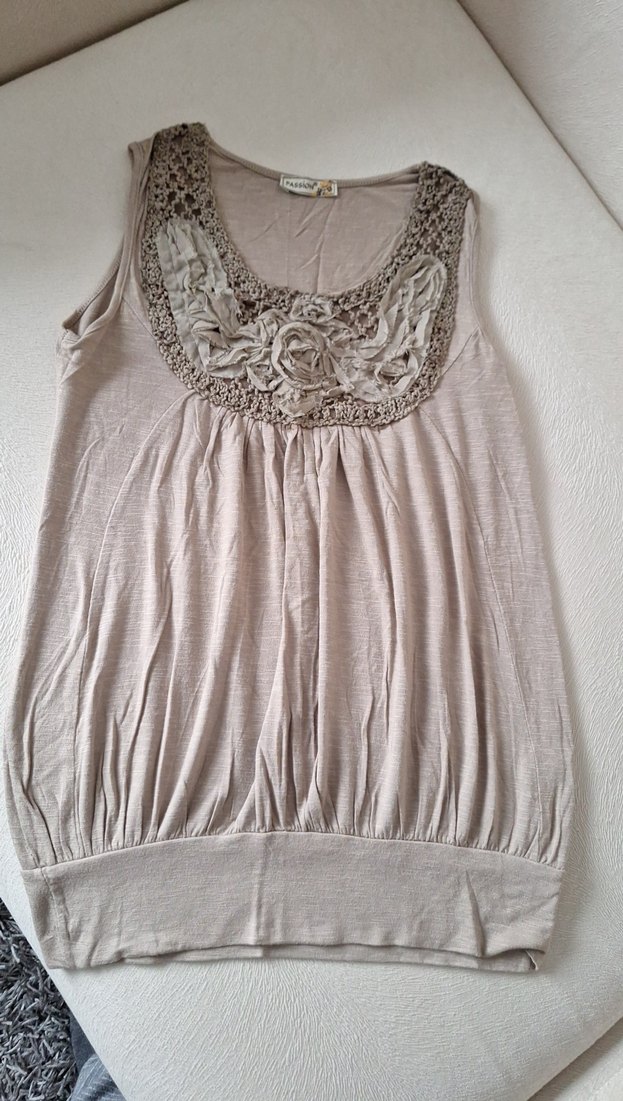 Krem rengi, kolsuz ve bol kesimli bu bluz, yuvarlak yakasında dantel detaylara sahiptir. Yumuşak keten kumaştan, midi boyda ve bohem tarzındadır.