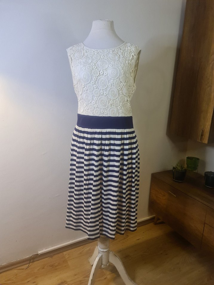 Dantel detaylı üst kısmı ve çizgili midi etekli, salaş kesimli kolsuz örme elbise, bohem tarzıyla günlük rahatlığı birleştirir.