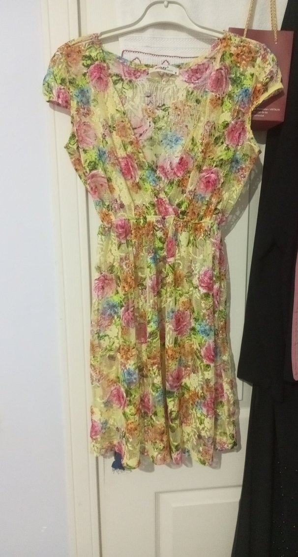 Dantel detaylı, V yaka ve kolsuz bohem midi elbise, pastel tonlarda batik desenli ve sentetik kumaştan, bol kesim.