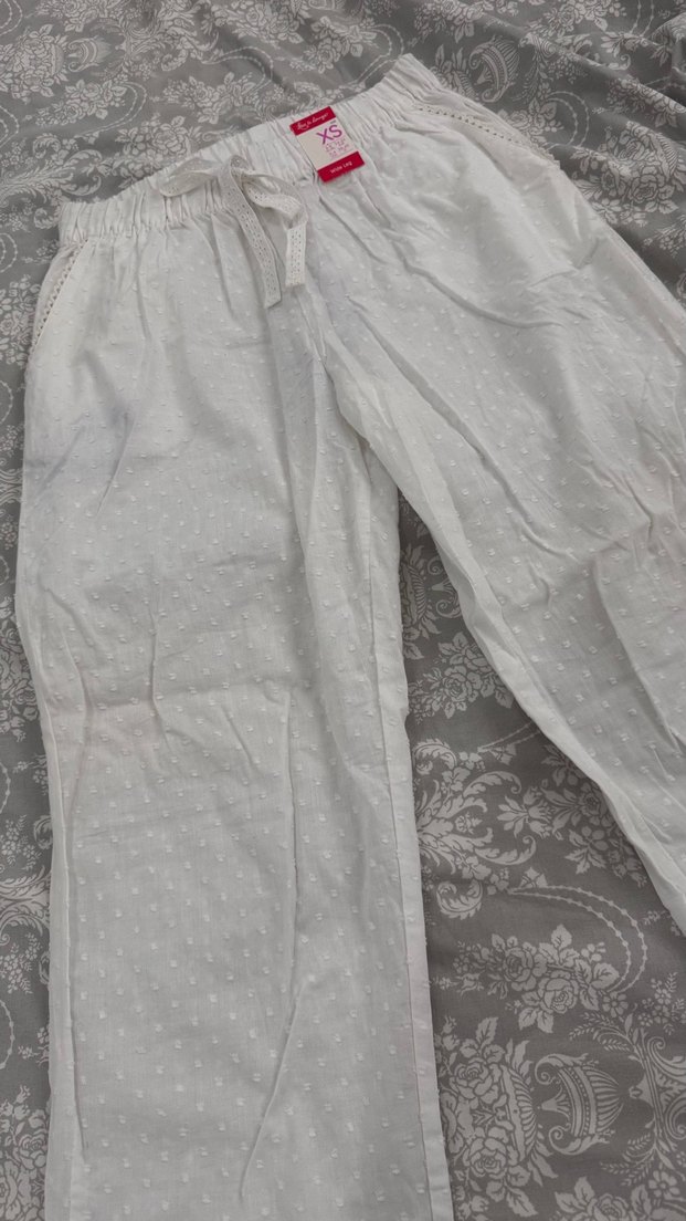 Pamuklu, rahat kesim, dantel detaylı beyaz pantolon. Bohem tarzı ve rahat bir görünüme sahip, günlük kullanıma uygun. İç gösteriyor