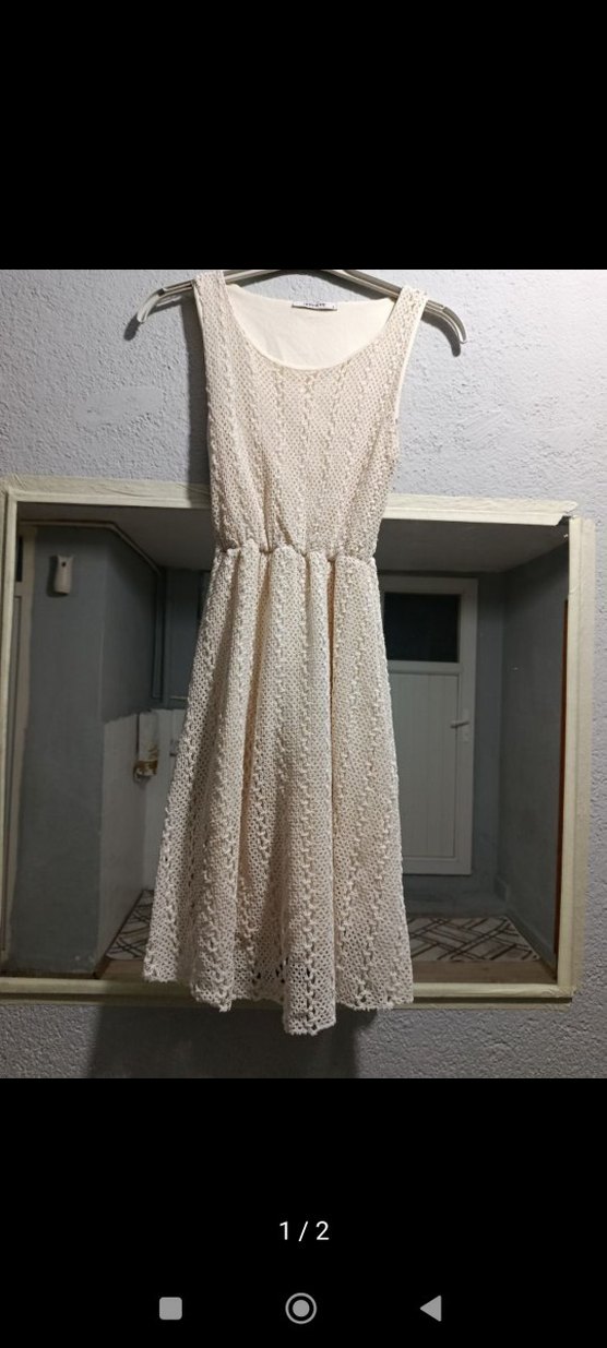 Dantel detaylı, V yaka ve kolsuz bohem triko elbise. Pastel beyaz renkte, midi boyda ve vintage tarzda, düğünler için uygun.