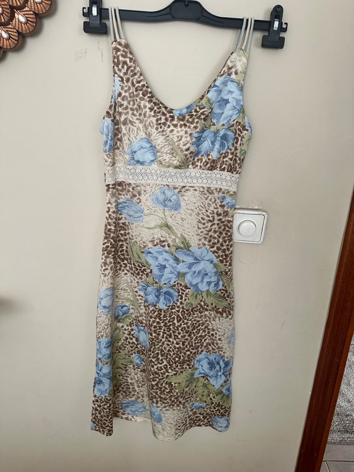 V yaka, dantelli, baskılı ve bohem tarzda, bej renkli, ince askılı mini elbise.