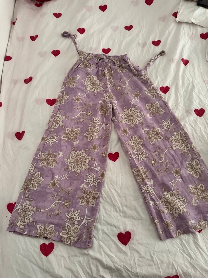 Dantel detaylı, uzun boylu, bol kesim mor pantolon. Çiçek desenleri ve 1 kere giyildi