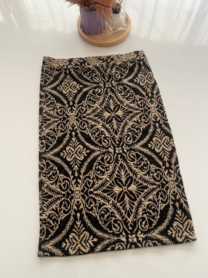 Dantel detaylı, siyah gold nakışlı tekstil malzemeden yapılmış, vintage bohem tarzında, ofis kullanımı için uygun, vücuda oturan midi kalem etek. MARKA TEMSİLİ!!