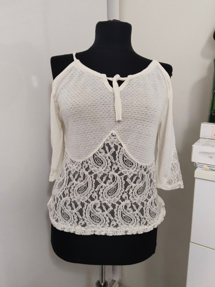 Beyaz renkli örgü bluz, straplez yakası ve askılı kolları ile dantel işlemeli detaylara sahip, bol kesim ve kısa boyda bohem tarzda.