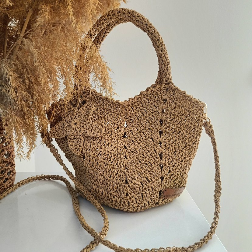 çanta çarmlı, örgüden yapılmış bohem tarzı kahverengi kadın çantası. Lale formunda ve örgü saplı, günlük kullanım için uygundur.