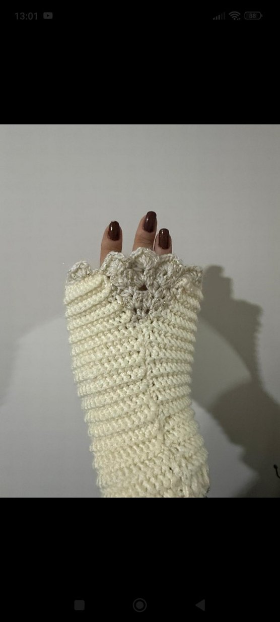 Dantel detaylı, örgü beyaz kadın eldiveni. Bohem tarzıyla rahat ve retro hippie görünüm sunar. Parmaksız tasarımı şıklık katar.