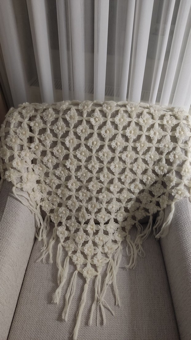 Örgü kumaştan yapılmış, dantel detaylı ve püsküllü kenarlarıyla bohem tarzını yansıtan kadın şalı. Köşe kısmında örgü hatası mevcut. Fotoğrafta belirttim. Genişliği 140 cm, uzunluğu 70 cm