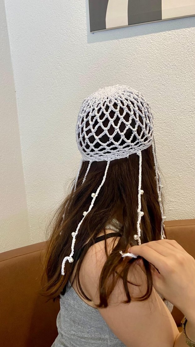 Dantel detaylı, uzun örgülü saçaklara sahip beyaz örme kadın şapkası. Bohem ve retro tarzı yansıtır. Hippie stiline uygundur.