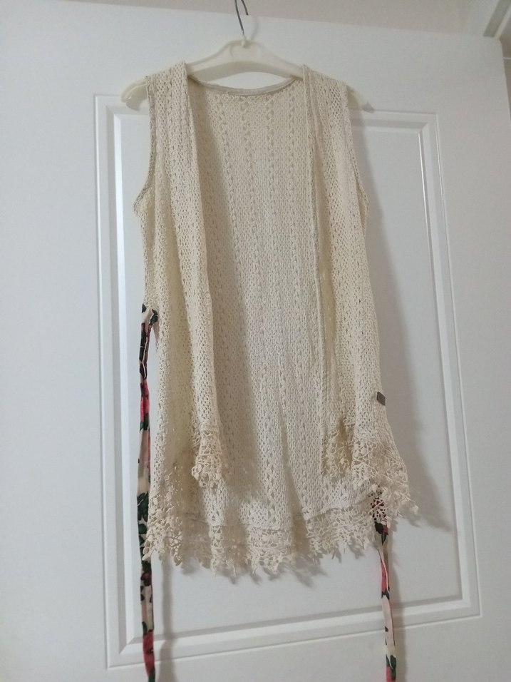 Dantel detaylı, işlemeli desenlere sahip, örgü kumaştan yapılmış bol kesim bohem kolsuz yelek. Hafif beyaz renkte, günlük kullanıma uygun.