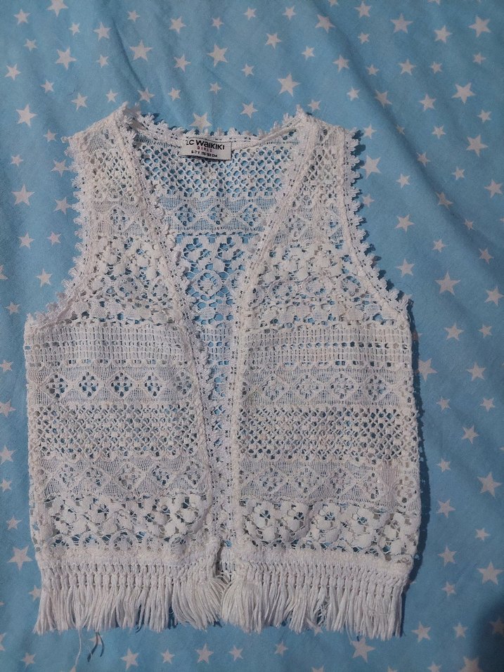 Beyaz renkte, dantel ve nakış detaylı, V yaka, püsküllü, bohem tarzda, örgü kumaştan, kolsuz, normal boy kız çocuk yelek.