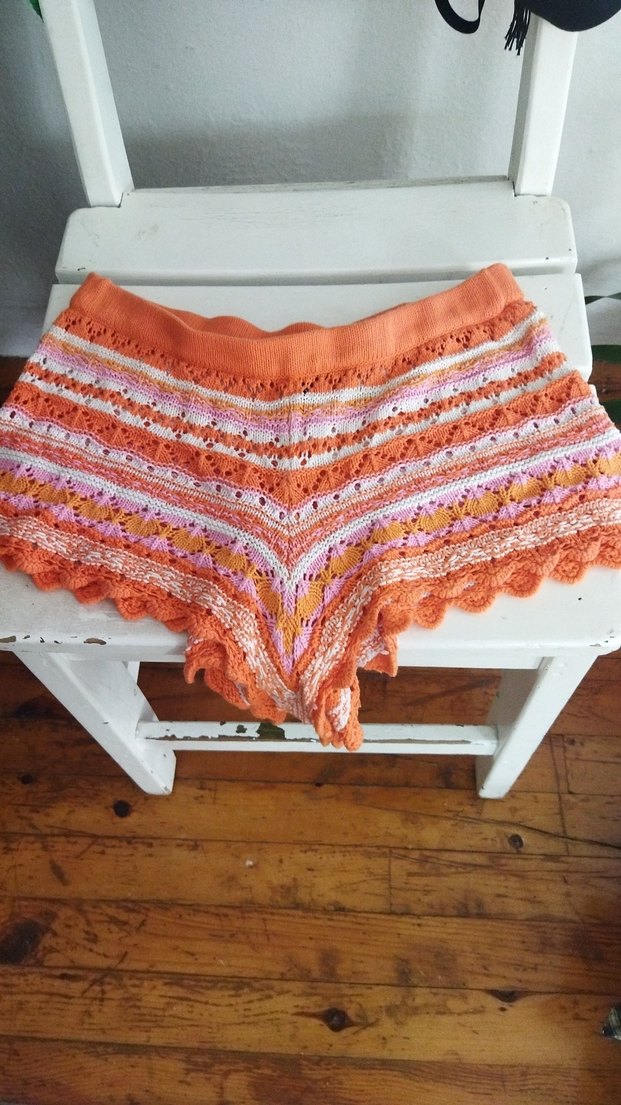 Dantel detaylı, pastel çok renkli örgü kumaştan yapılmış, bol kesim hamile şortu. Bohem tarzı ve kısa boyu günlük kullanım için uygundur.