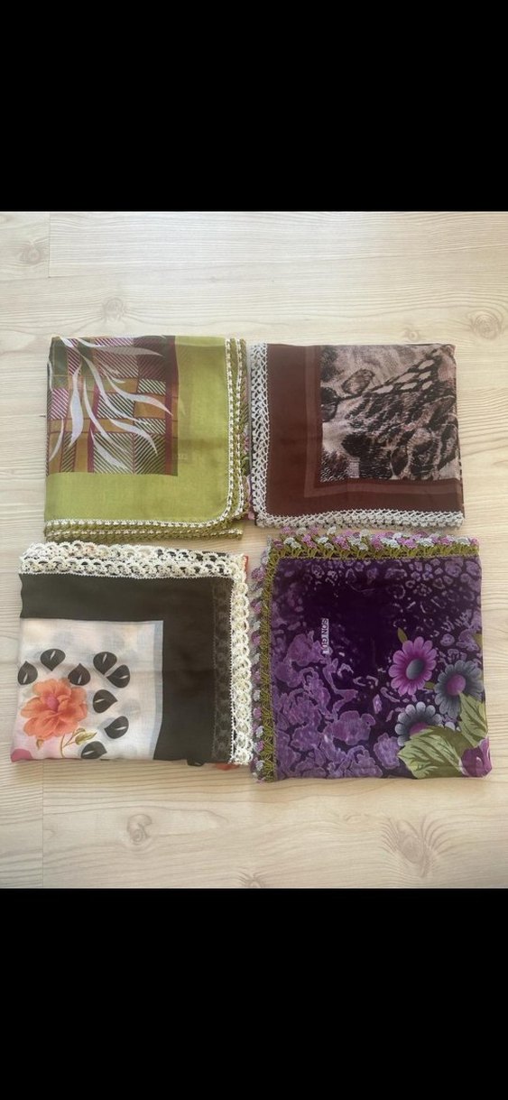 Dantel kenarlı, koyu ve canlı renklerde dört adet bohem tarzda kadın Tülbent kullanılmamış çeyizlik ürünlerdir fiyat Tane fiyatı dir