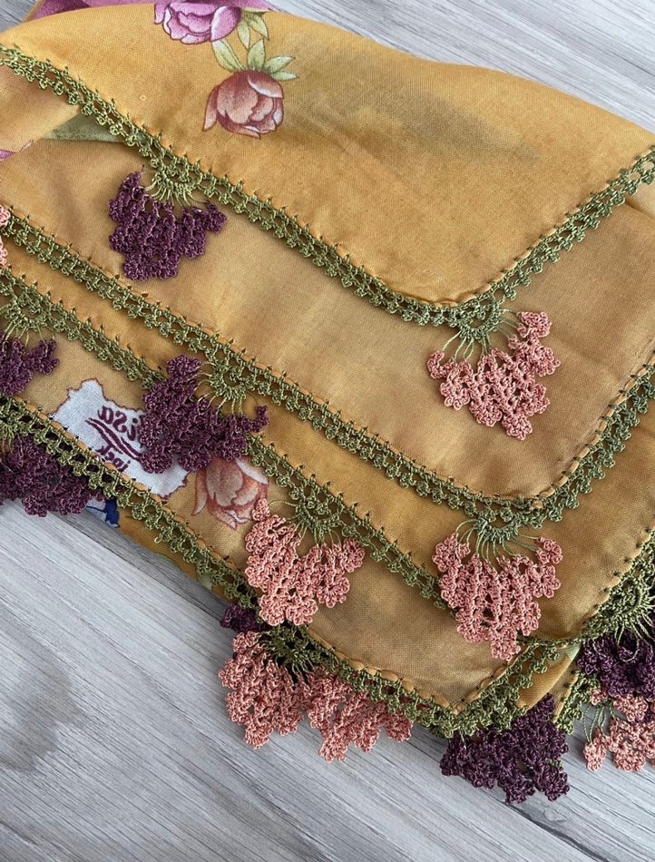 Pastel çok renkli, dantel detaylı ve bohem triko dokusuna sahip kadın şalı, retro ve hippie tarzına uygundur.