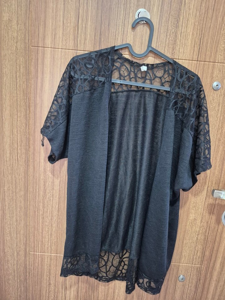 Siyah midi hırka, kısa kollu ve dantel detaylıdır. Bol kesim ve V yaka ile rahat, bohem bir tarz sunar. ben bikini üstüne kullandım,çok kullanışlı ve şık bir parça.boyu 70cm, iki koltuk arası 54cm. hiçbir deformasyonu yok