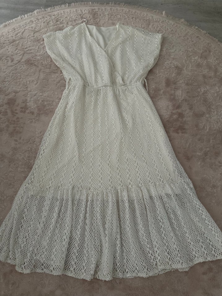 Dantel işlemeli, V yaka ve askılı kollara sahip uzun beyaz triko elbise, bol kesimiyle bohem tarzını yansıtıyor.