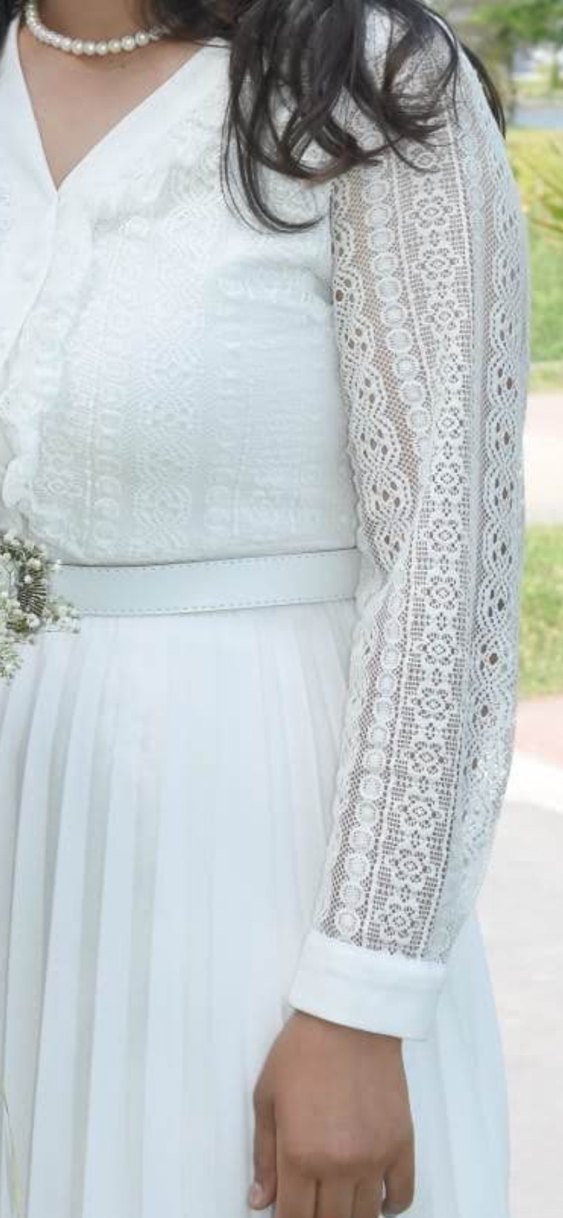 Dantel kol detaylı, nakışlı desenli, tekne yaka ve bohem tarzında klasik şıklık sunan uzun beyaz nişan elbisesi.