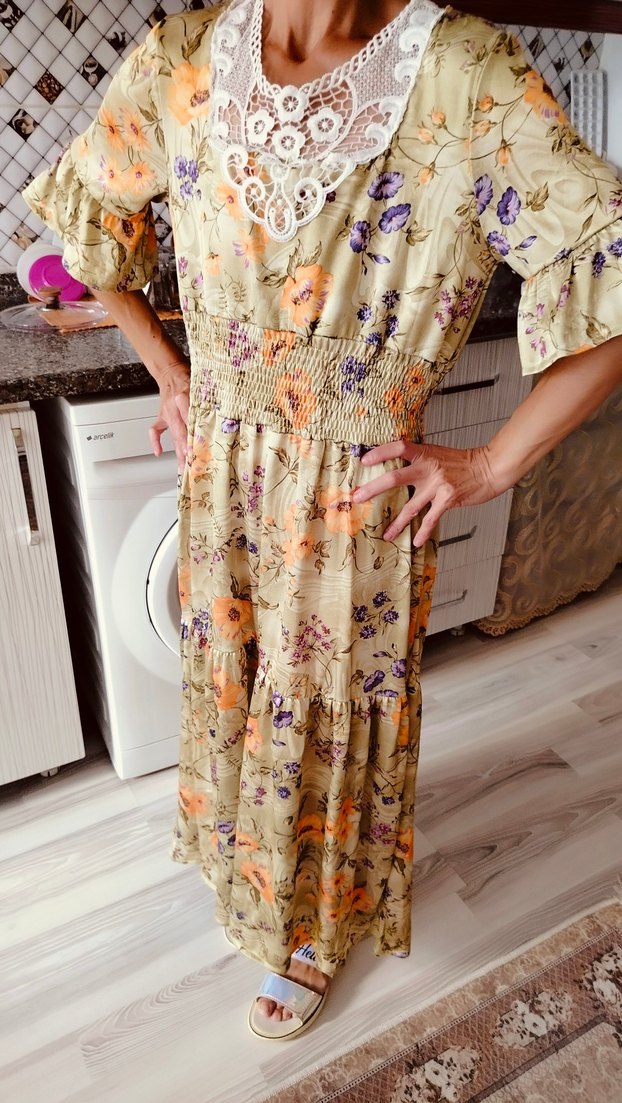 Dantel detaylı V yaka, bol kesim bohem uzun elbise. Hafif kahverengi çiçek desenli, yumuşak sentetik kumaştan yapılmıştır. Anneme bol geldiğinden satıyoruz.