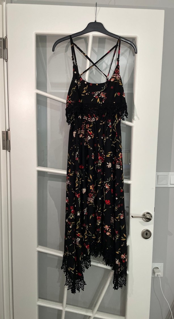 Dantel detaylı, askılı ve straplez yaka uzun bohem elbise. Koyu renkli çiçek desenleri ve bol kesimiyle romantik akşamlar için uygun.