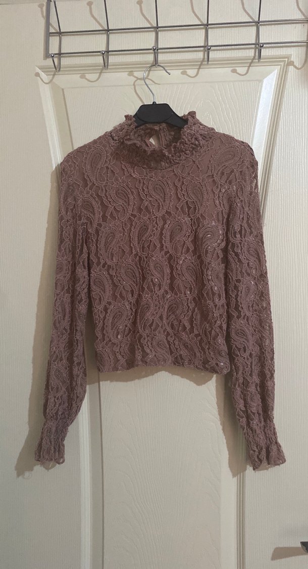 Dantel detaylı, uzun kollu ve yüksek yakalı, vücuda oturan kadın bluzu. Bej-gri tonlarında, bohem tarzında ve günlük kullanıma uygun.