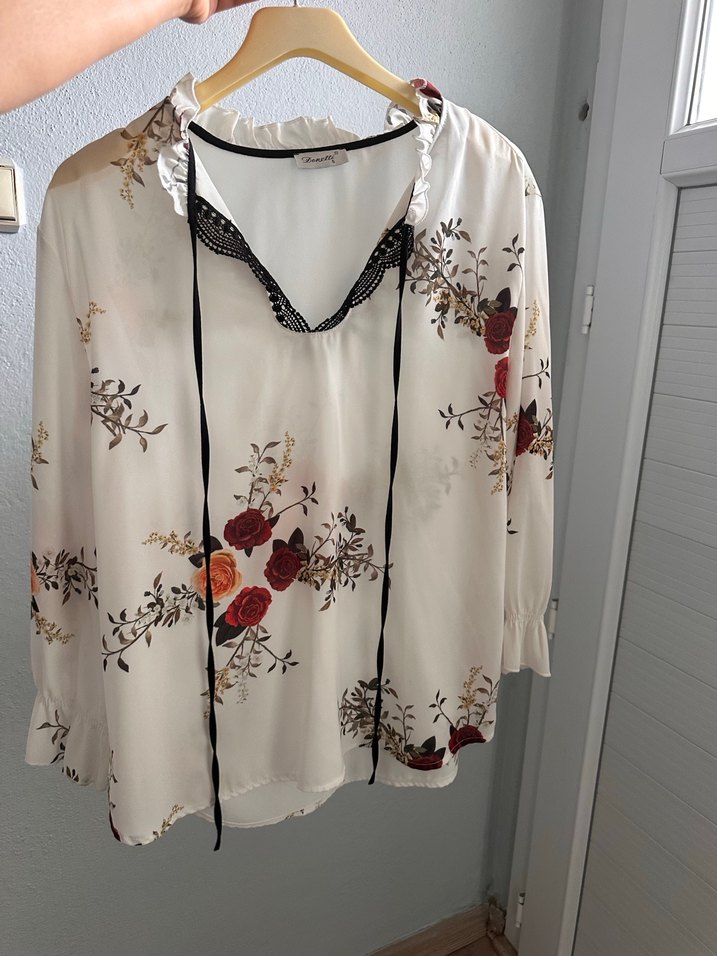 Dantel ve çiçek desenleriyle süslenmiş, bol kesim, uzun kollu ve V yaka beyaz bluz. Bohem stil için uygun, günlük kullanıma ideal.