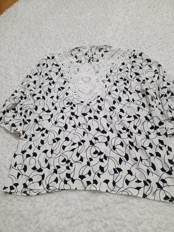 Beyaz ve gri desenli bu bluz, dantel detaylı V yaka, kısa kollu ve bol uzun kesime sahiptir, bohem tarzı için uygundur.