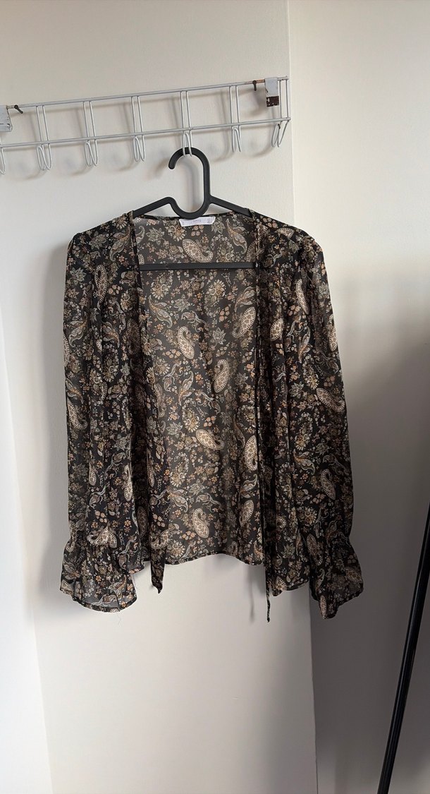 Kahverengi, uzun kollu, bol kesim kadın bluz. Dantel detaylı, V yaka ve koyu renkli batik desenlidir. Günlük kullanıma uygundur.