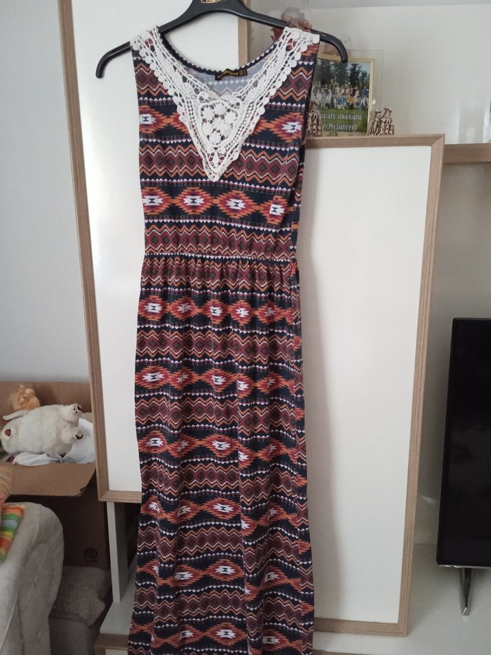 Dantel Detaylı Bohem V Yakalı Uzun Elbise