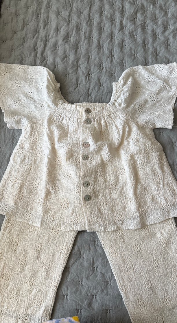 Dantel detaylı, bol kesim krem örme kumaş pantolon ve üst , rahat ve bohem tarzda, günlük kullanıma uygun.