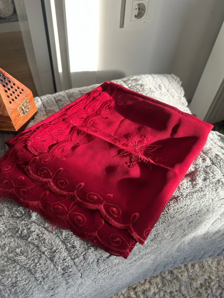 Bordo renkli, dantel detaylı ve parlak görünümlü, ipek gibi yumuşak dokulu kadın eşarp