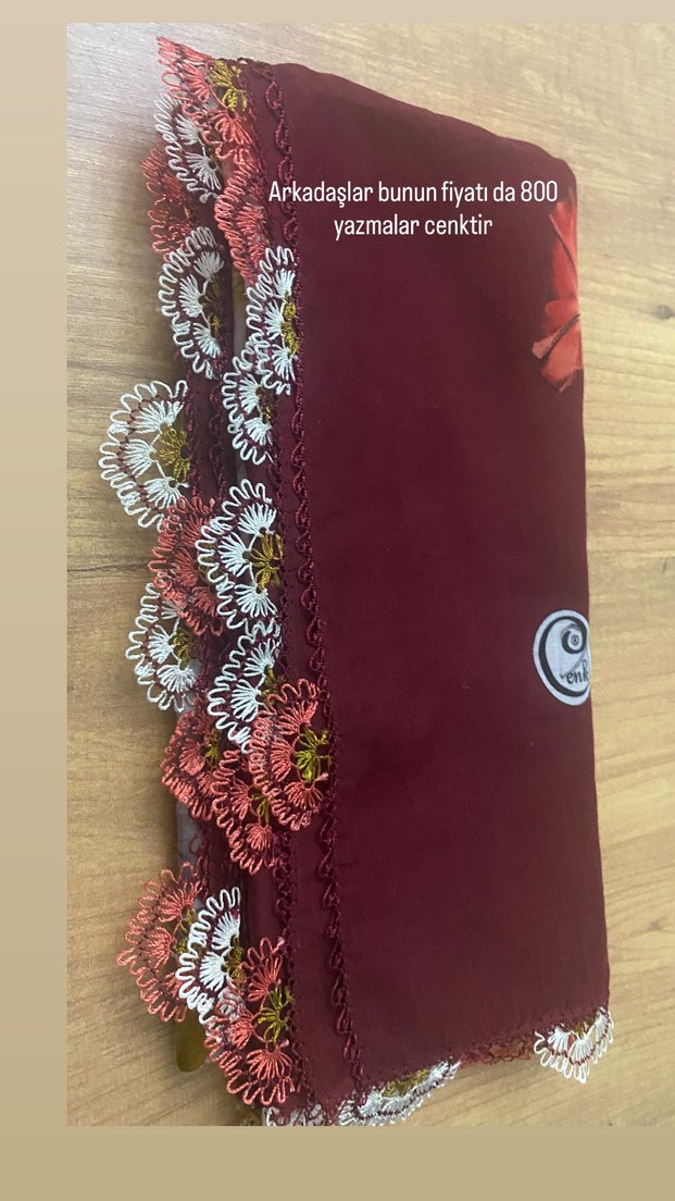 Koyu bordo renkte, çiçek desenli dantel kenar detayına sahip, bohem tarzda kadın yazması. İğne oyasi