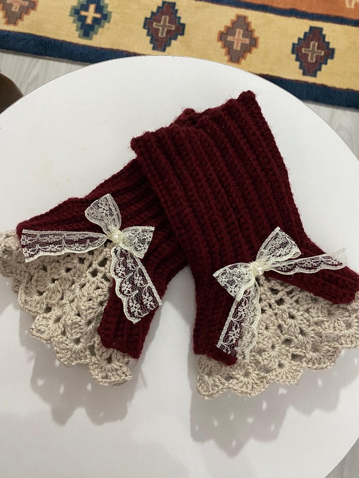 Bordo renkli örgü eldivenler, dantel ve fiyonk detaylarıyla sıcak ve bohem bir tarz sunar. Özel bir dokunuş için ideal.